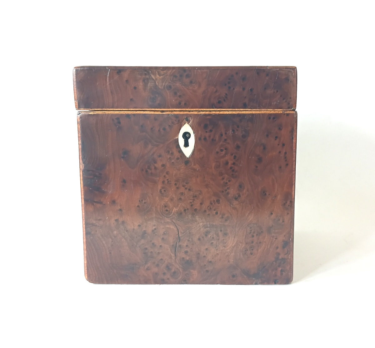 A Fantastic George III Small Burr Yew Square Cube Tea Caddy With Boxwood Strung Edges And Original Brass Hinges. 100mm Square x 115mm High. Circa 1780. Magnificent Well Figured Burr Yew Veneers, One Pin Replaced In Hinges, The Escutcheon Possibly Replaced, Not That You'd Notice. Provenance : Phil Leitch (1951-2024) Restorer And Collector Of Small Boxes, Especially Georgian Caddies.