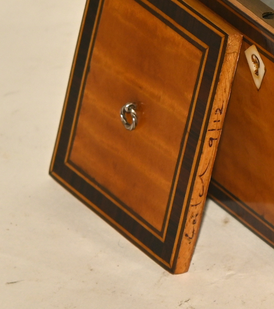 A Modern Phil Leitch Georgian Style Satinwood Rectangular Tea Caddy With Quartered Sloping Cover, 2 Bay Lined Interior And Flat Sides With Metal Drop Ring Handles And Acanthus Mounts, All Sides Rosewood Cross Banded With Boxwood Stringing; Functioning Lock With Key. 170mm Wide x 100mm Deep x 145mm High. One Cover Signed And Dated "Leitch 12." Pristine Condition, Unrivalled Quality. Provenance : Phil Leitch (1951-2024) Restorer And Collector Of Small Boxes, Especially Georgian Caddies.