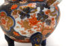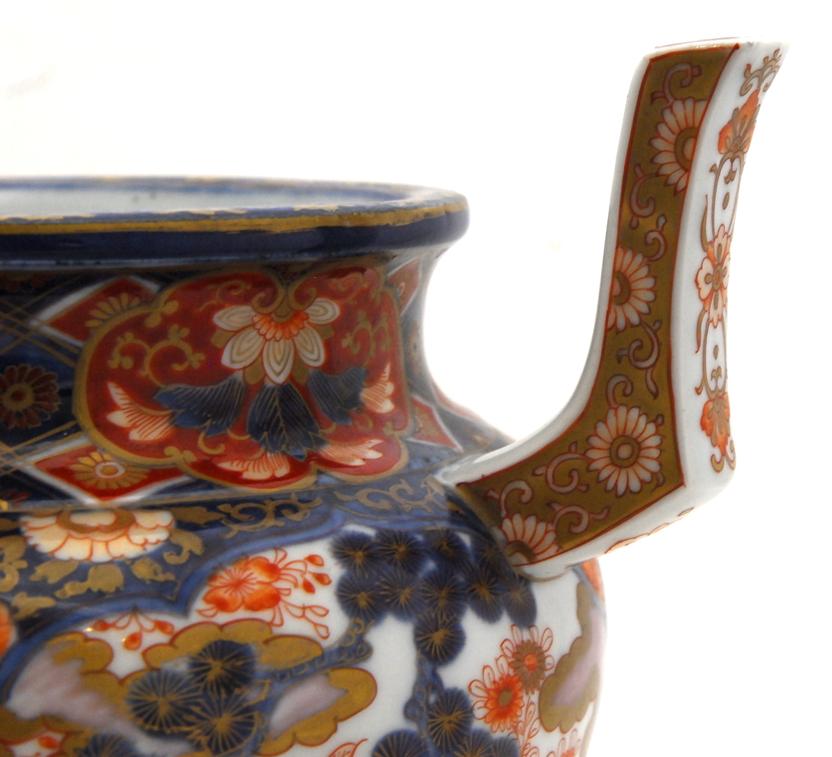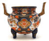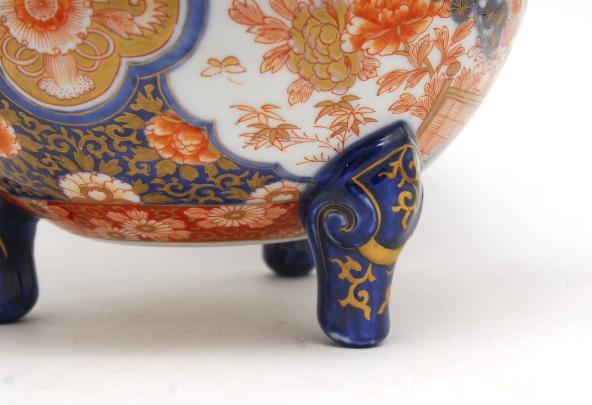 ZD313 19thC Japanese Meiji Period Imari Koro A Most Decorative 19thC Japanese Meiji Period Imari Koro With Raised Handles, 3 Feet And Flattened Spherical Body Painted In A Typical Lavishly Gilded Palette Of Iron Red And Cobalt Blue With Alternating Panels Of Fenced Gardens Featuring Pines, Peony And Birds. 268mm Wide Across Handles x 154mm Diameter Of Top x 210mm High To Top Of Handles. Circa 1880. Lacks Cover Otherwise Excellent Condition ; Flower Arrangement Courtesy Of Lulu At Cellar Daisy, Kelburn Village.