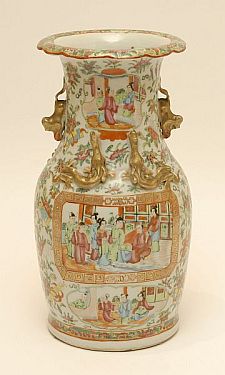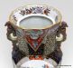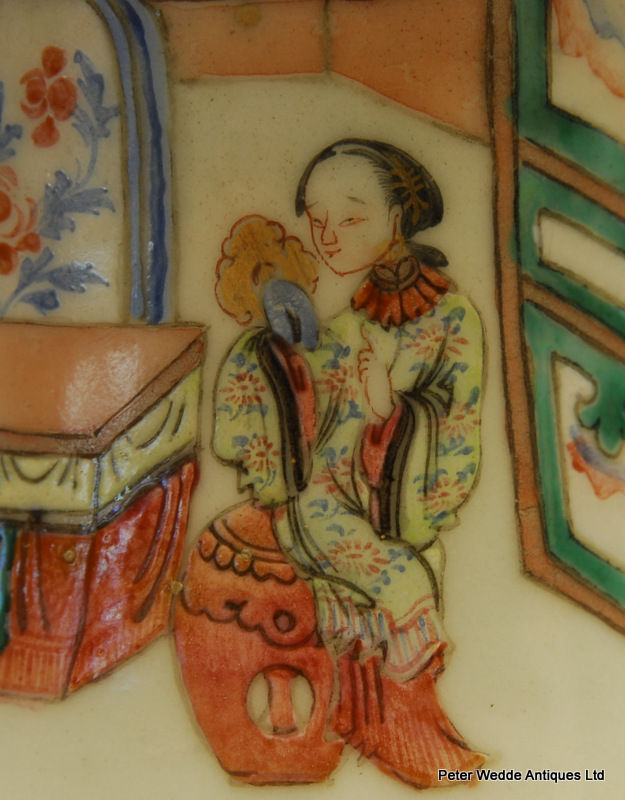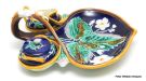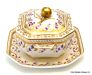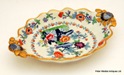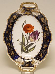 porcelain two handled dish. Decorated in bright fanny rose enamels with