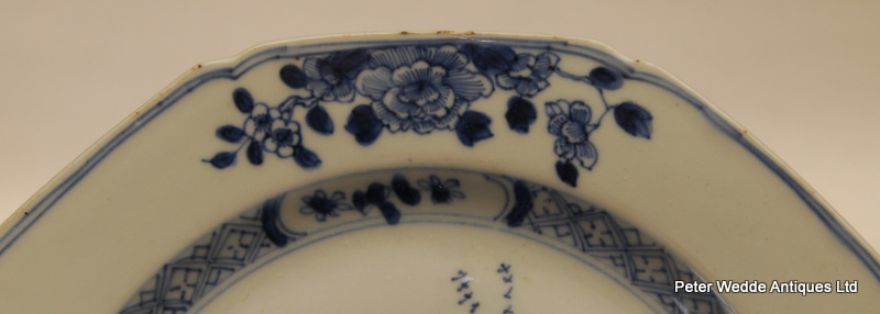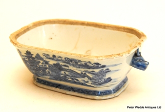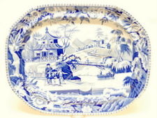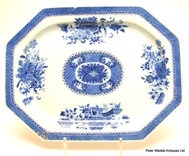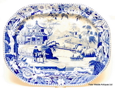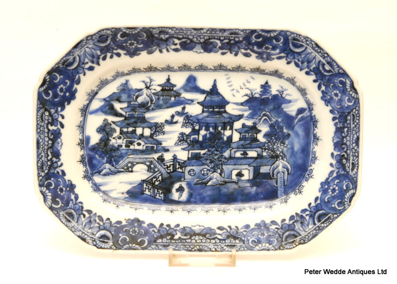 A Good Late 18thC Chinese Export Blue And White Porcelain Octagonal Rectangular Meat Plate Painted With Pagodas In A River Landscape. 245mm x 172mm. Circa 1800. Excellent Condition. |