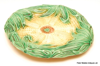 | A19th century majolica cheese dome and stand. Chip to stand and crack to dome. |